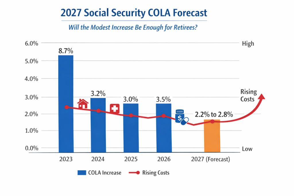 The 2027 Social Security COLA forecast currently suggests a cost-of-living adjustment of roughly 2.2 percent to 2.8 percent based on early inflation trends. The final number will depend on inflation data recorded between July and September of 2026, with the official announcement expected in October 2026 and new payments starting January 2027. While this range may seem normal historically, it comes after years of unusually high inflation adjustments earlier in the decade. Financial planners say the smaller increase does not necessarily mean lower expenses for retirees. Instead, it reflects broader economic cooling while real senior living costs, especially healthcare and housing, may continue to climb faster.