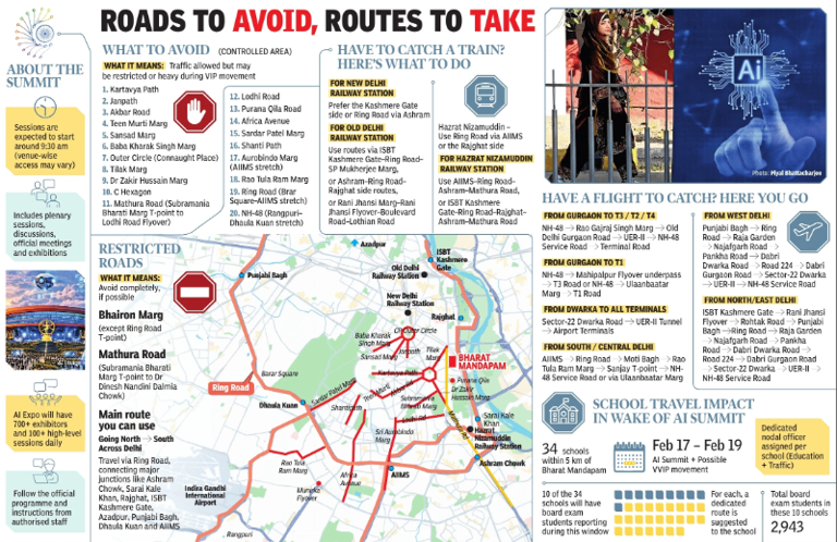 The AI Summit 2026 has prompted sweeping traffic restrictions across central parts of India’s capital, as international political leaders, technology executives, and security delegations converge on Bharat Mandapam at Pragati Maidan. Authorities imposed controlled road closures and convoy corridors throughout the week, warning commuters of delays, especially during peak travel hours and urging residents to follow the Delhi traffic advisory.