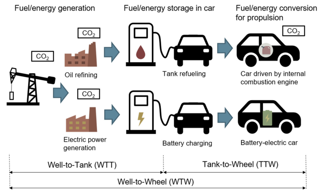 - Well-to-wheel or lifecycle emissions (energy production + vehicle use)